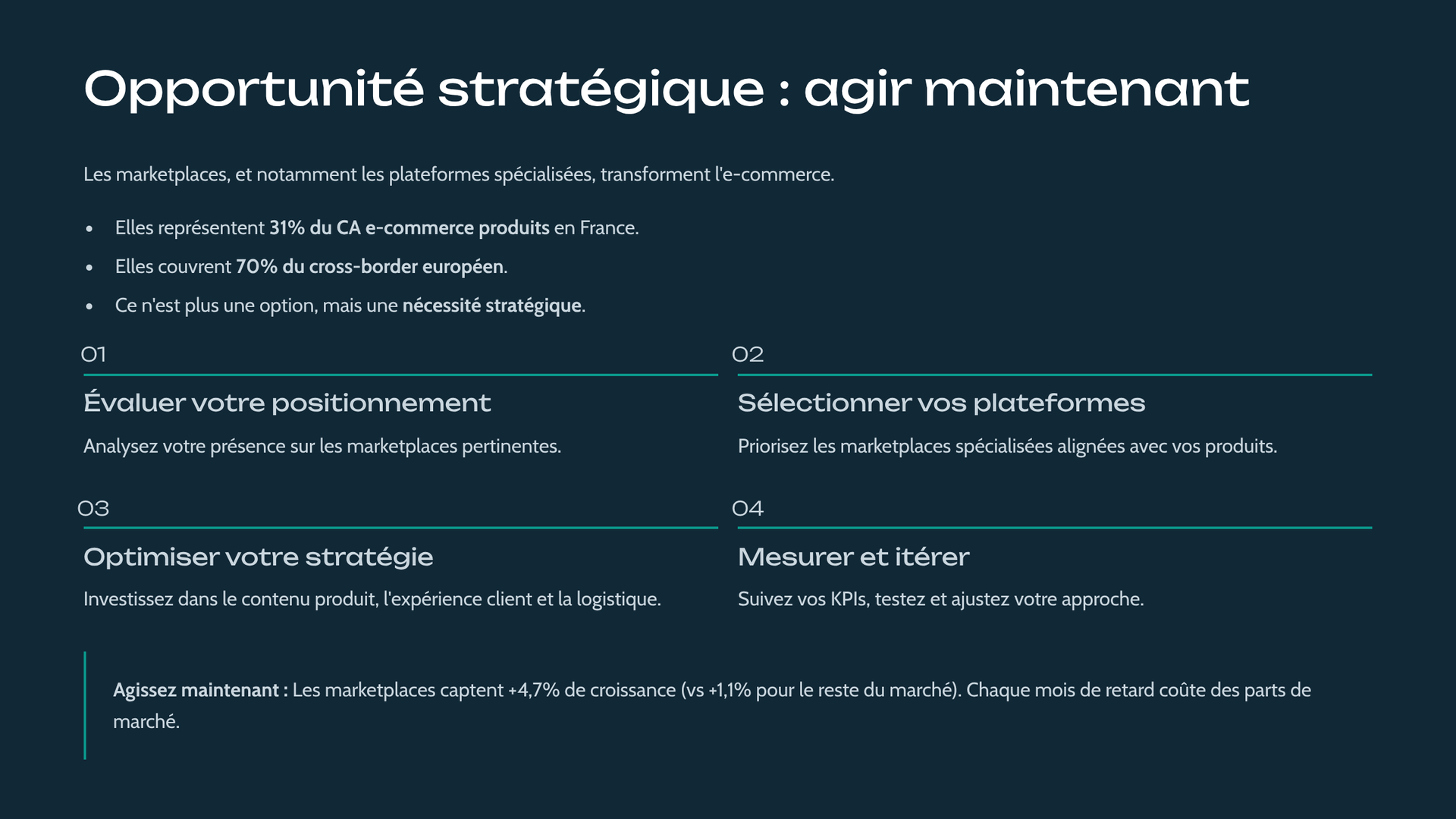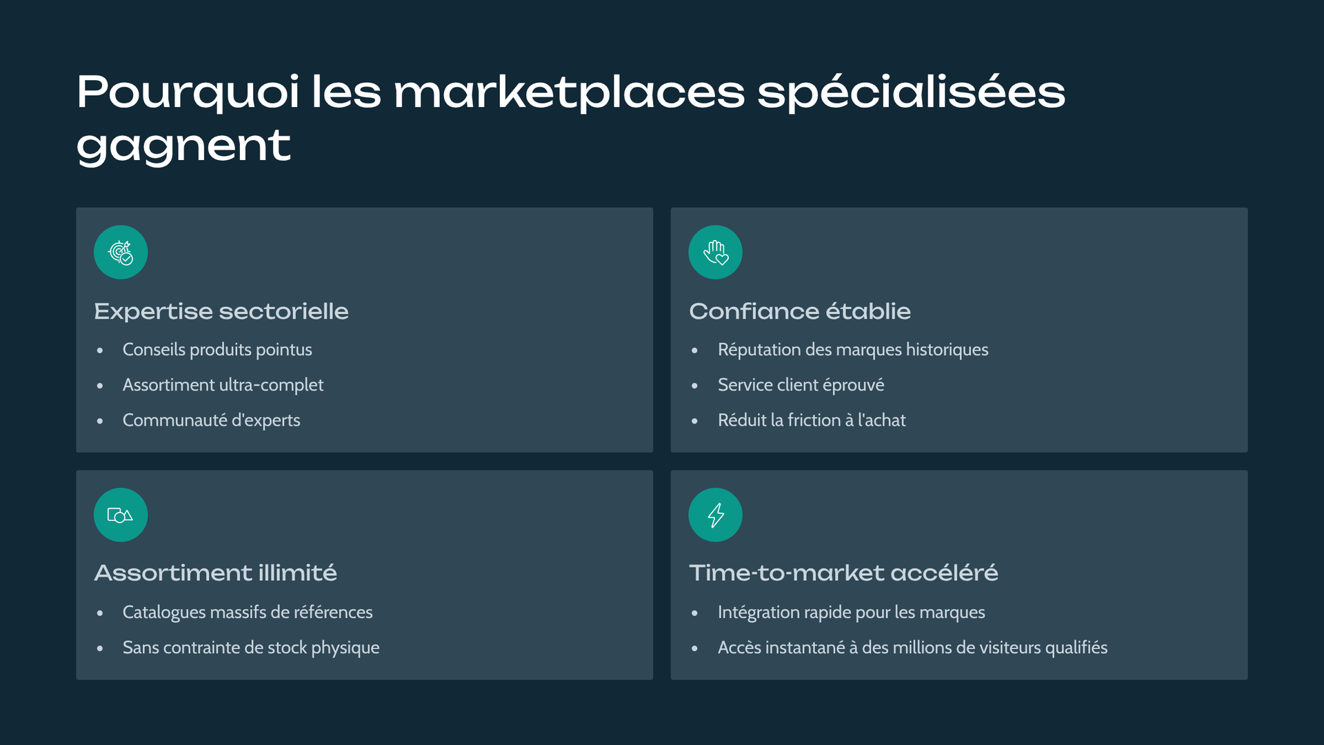 Oui, parce que tu ne remplaces pas ton site : tu ajoutes un canal. Les marketplaces servent à capter de nouveaux clients, lisser les périodes creuses et réduire ta dépendance à la pub. Ton site reste ton “hub” (marque, CRM, réachat), la marketplace devient ton “acquisition”.